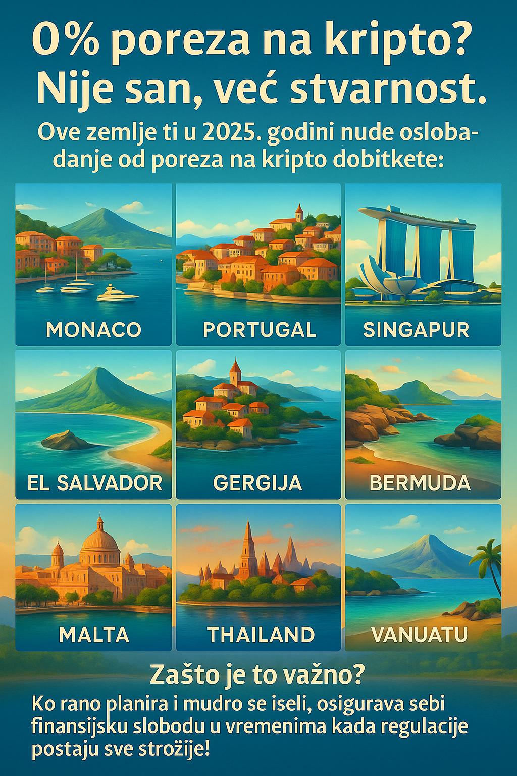 Promotivna grafika s natpisom 0% poreza na kripto? Nije san, već stvarnost iznad ilustracija devet zemalja koje nude oslobađanje od poreza na kripto dobitke 2025: Monako, Portugal, Singapur, El Salvador, Gruzija, Bermuda, Malta, Tajland i Vanuatu.