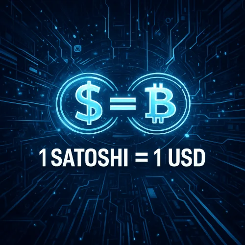 Na futurističkoj slici, neon-plavi simboli dolara i Bitcoina povezani su znakom jednakosti, s natpisom 1 SATOSHI = 1 USD ispod. Digitalna ploča u pozadini pojačava viziju pariteta Satoshi-ja i USD-a.
