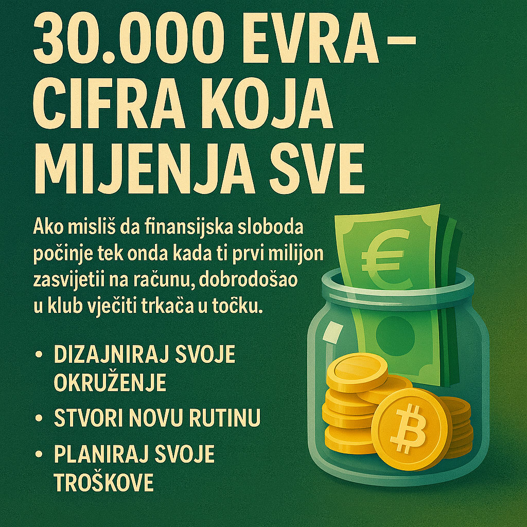Digitalna ilustracija s naslovom 30.000 EURA – BROJKA KOJA MIJENJA SVE. Prikazuje staklenku eura i zlatnika uz Bitcoin, te savjete za financijsku slobodu i planiranje troškova na tamnozelenoj pozadini.