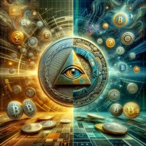 Slika prikazuje dvije polovice, zlatnu i plavu, koje simboliziraju suvremenu tehnologiju i kriptovalute. Na sredini se nalazi oko unutar piramide, okruženo simbolima kriptovaluta, dok mreže i uzorci pozadine ističu povezanost modernog digitalnog svijeta.
