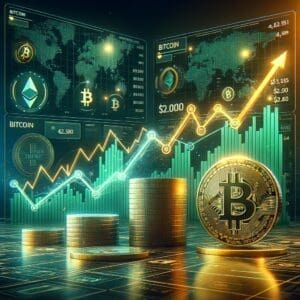 Digitalna ilustracija prikazuje svijet trgovanja kriptovalutama s naglaskom na Bitcoin. Sjajni zlatni novčići u prvom planu simboliziraju bogatstvo, dok pozadinski ekrani prikazuju uzlazne financijske grafikone i globalne trendove, evocirajući prosperitet i inovacije u blockchain tehnologiji.
