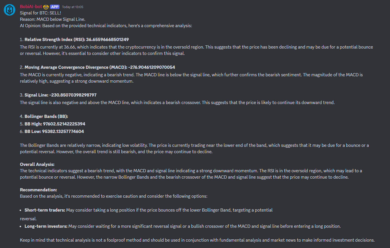 Komanda !signal BTC (ili bilo koji drugi simbol kripto projekta) koristi najnovije AI modele za analizu tržišnih podataka u stvarnom vremenu i generiranje signala za trgovanje. Skripta dohvaća najnovije informacije o cijeni odabranog kripto projekta. Na temelju ključnih tehničkih indikatora poput MACD-a, RSI-a, Bollingerovih bendova i razina podrške i otpora daje preporuke za kupnju ili prodaju.