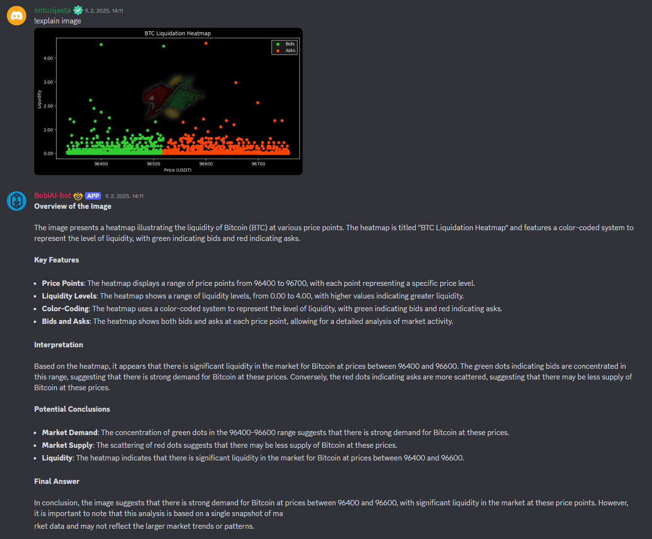 Komanda !analyzeh BTC (ili bilo koji drugi simbol kripto projekta) generira heatmap likvidnosti, vizualizirajući raspodjelu likvidnosti na tržištu. Ova toplinska mapa prikazuje gdje se nalaze najveći nalozi za kupnju i prodaju. Omogućuje korisnicima bolje razumijevanje tržišnih uvjeta te identifikaciju potencijalnih ulaznih i izlaznih točaka.
