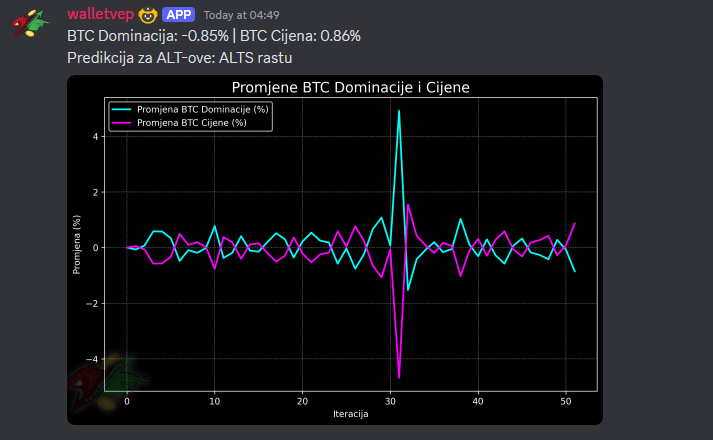 Ovaj alat prikuplja ključne podatke o BTC dominaciji, cijeni BTC-a i tržišnoj kapitalizaciji altcoina. Pruža korisnicima automatsku analizu tržišta. Pomoću ovih podataka, alat pomaže u brzoj identifikaciji tržišnih trendova. Na primjer, korisnici mogu uočiti povezanost između rasta BTC dominacije i opadanja vrijednosti altcoina te obrnuto. Alat omogućuje korisnicima praćenje tržišnih promjena bez potrebe za ručnom analizom. Tako štedi vrijeme i povećava efikasnost. Dodatno, alat koristi implementiranu logiku za predviđanje kretanja cijena altcoina, što korisnicima pomaže u donošenju boljih trgovačkih odluka i strategija za kriptovalute.