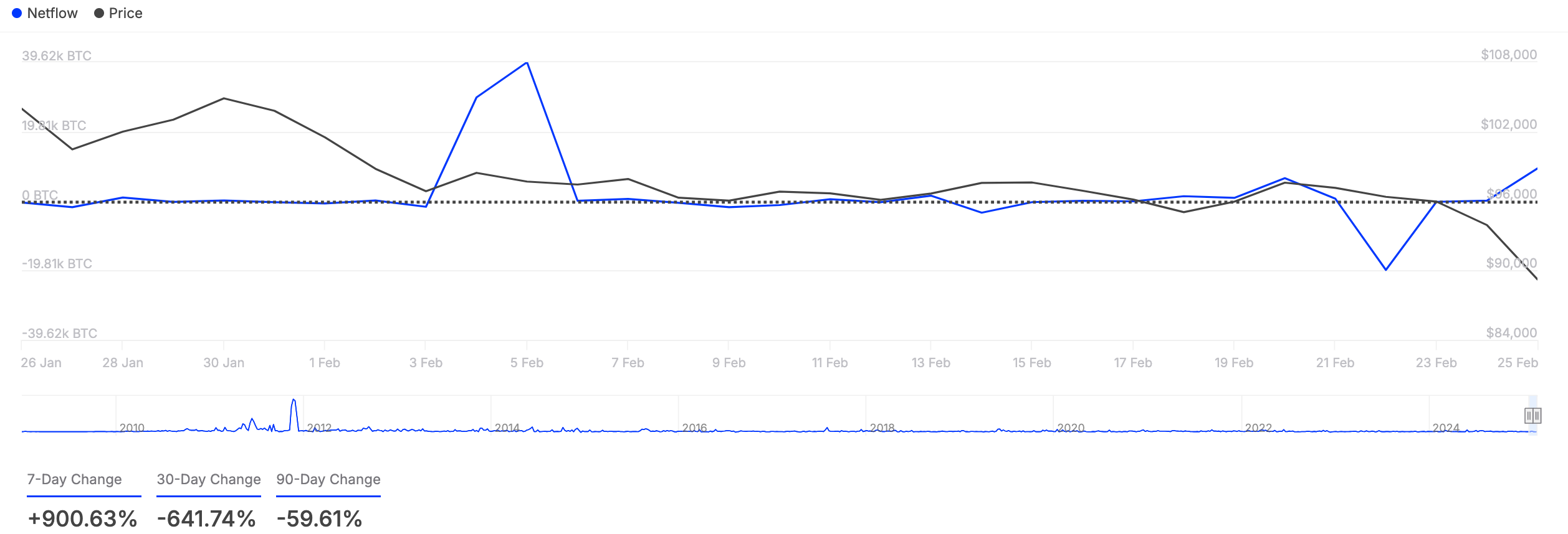 Grafikon prikazuje trendove net toka Bitcoina i cijene od 26. siječnja do 25. veljače 2025. Crne linije pokazuju fluktuacije u cijeni, dok plave linije prikazuju promjene u net toku, uključujući značajne šiljke i padove krajem veljače.