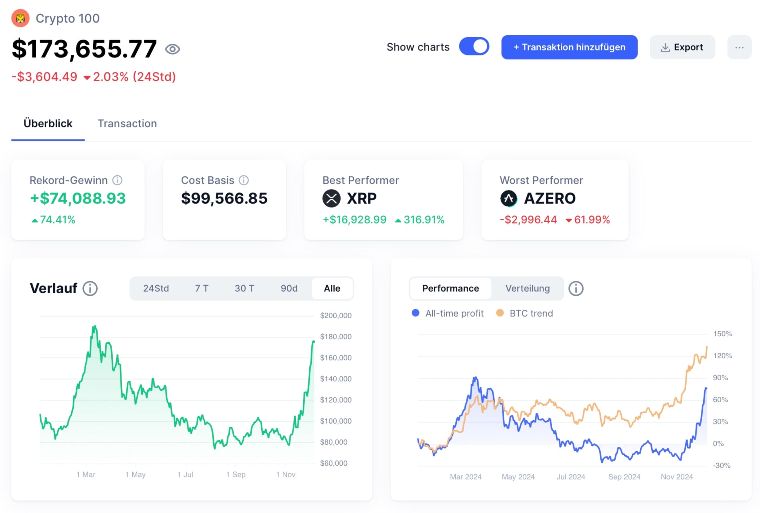 Slika prikazuje nadzornu ploču kripto portfelja Crypto 100 s ukupnom vrijednošću od $173,655.77, koja je opala za 2.03% u posljednja 24 sata. Ističe ključne metrike poput rekordnog profita, osnovne cijene i najboljih/najgorih performera, uz grafikon povijesnog rasta i usporedbe s Bitcoin trendovima.