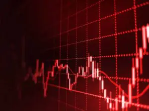 Financijski grafikon u nijansama crvene prikazuje izraženu volatilnost tržišta s oštrim usponima i padovima cijena dionica. Mreža u pozadini naglašava negativne trendove, čime se dočarava osjećaj hitnosti i nestabilnosti u ekonomskom okruženju.