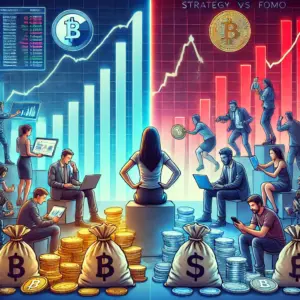 Slika prikazuje kontrast između analitičkog i impulzivnog pristupa trgovanju kriptovalutama. S lijeve strane, pojedinci u plavim tonovima mirno analiziraju podatke, dok s desne strane, u crvenim tonovima, ljudi slave i djeluju emocionalno, prikazujući dinamičnost tržišta. Centralna figura promatra oba svijeta, naglašavajući važnost ravnoteže u strategijama ulaganja.
