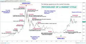 Grafikon prikazuje emocionalna stanja investitora tijekom ciklusa tržišta, od euforije i pohlepe na vrhuncu, preko tjeskobe i negodovanja, do straha i depresije pri gubicima. Ovaj ciklus naglašava volatilnost tržišta i psihologiju ulaganja, ponavljajući se do besparice.
