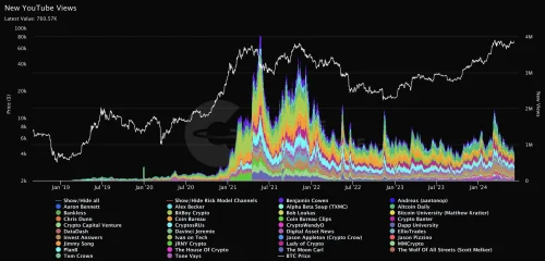 – Obojeni slojevi na grafu predstavljaju preglede različitih YouTube kanala posvećenih kriptovalutama. Vertikalna osa na desnoj strani pokazuje broj novih pregleda u milionima.