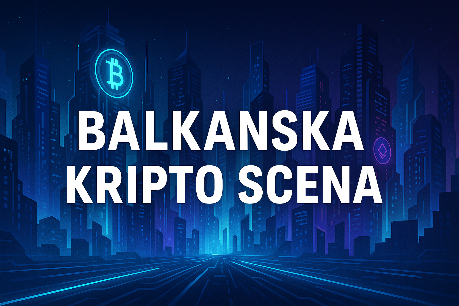 Slika prikazuje futuristički digitalni grad noću, s natpisom BALKANSKA KRIPTO SCENA, simbolima Bitcoina i Ethereuma te blještavim neboderima i tehnološkim elementima u plavim i ljubičastim tonovima.