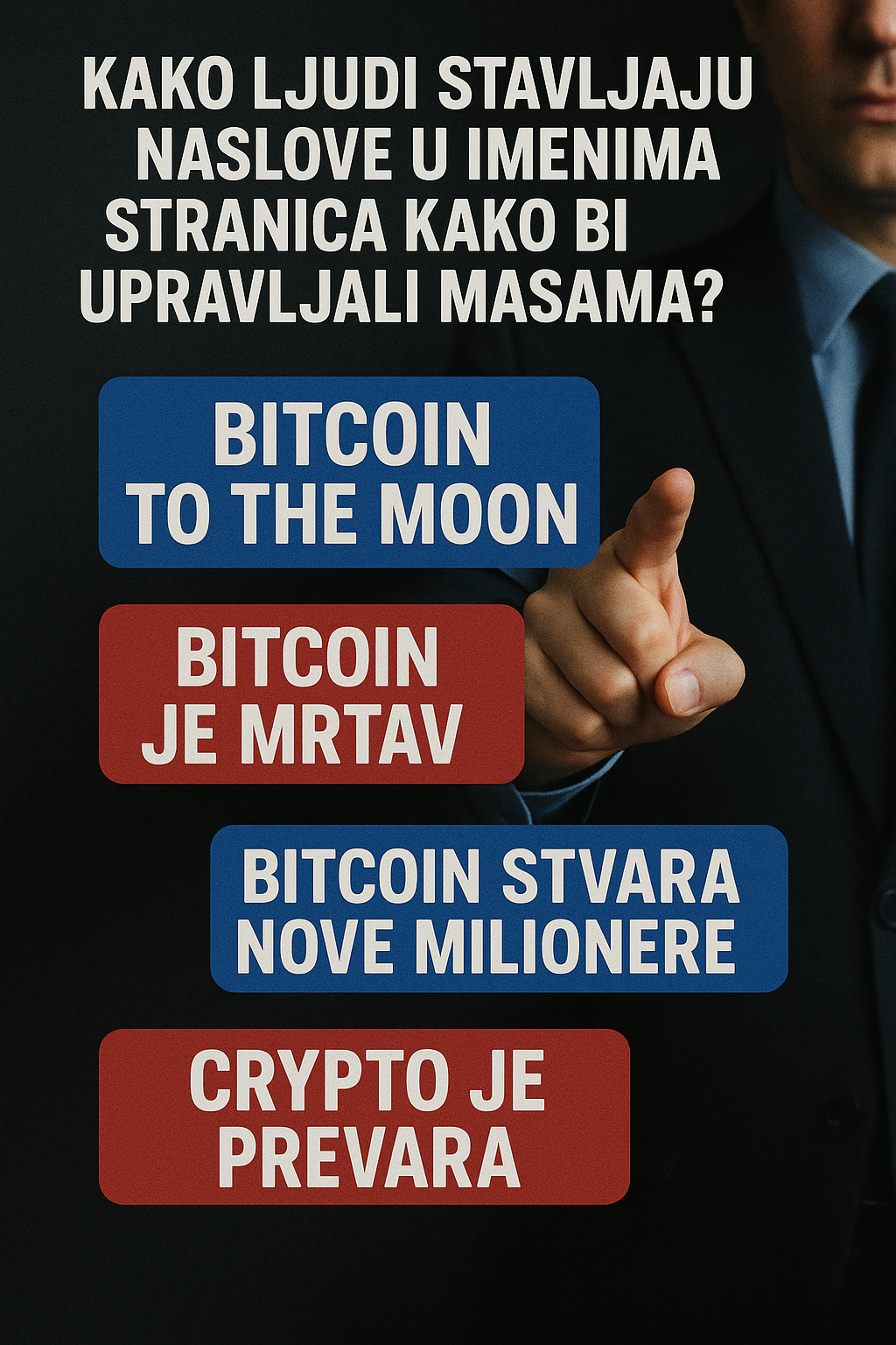 Slika prikazuje prst uperen prema tamno odjevenoj osobi u pozadini, s tekstom koji kritizira medijske naslove o kriptovalutama. Alternativni pravokutnici u plavoj i crvenoj boji iznose suprotstavljena mišljenja o Bitcoinu, od optimizma do skepsa.