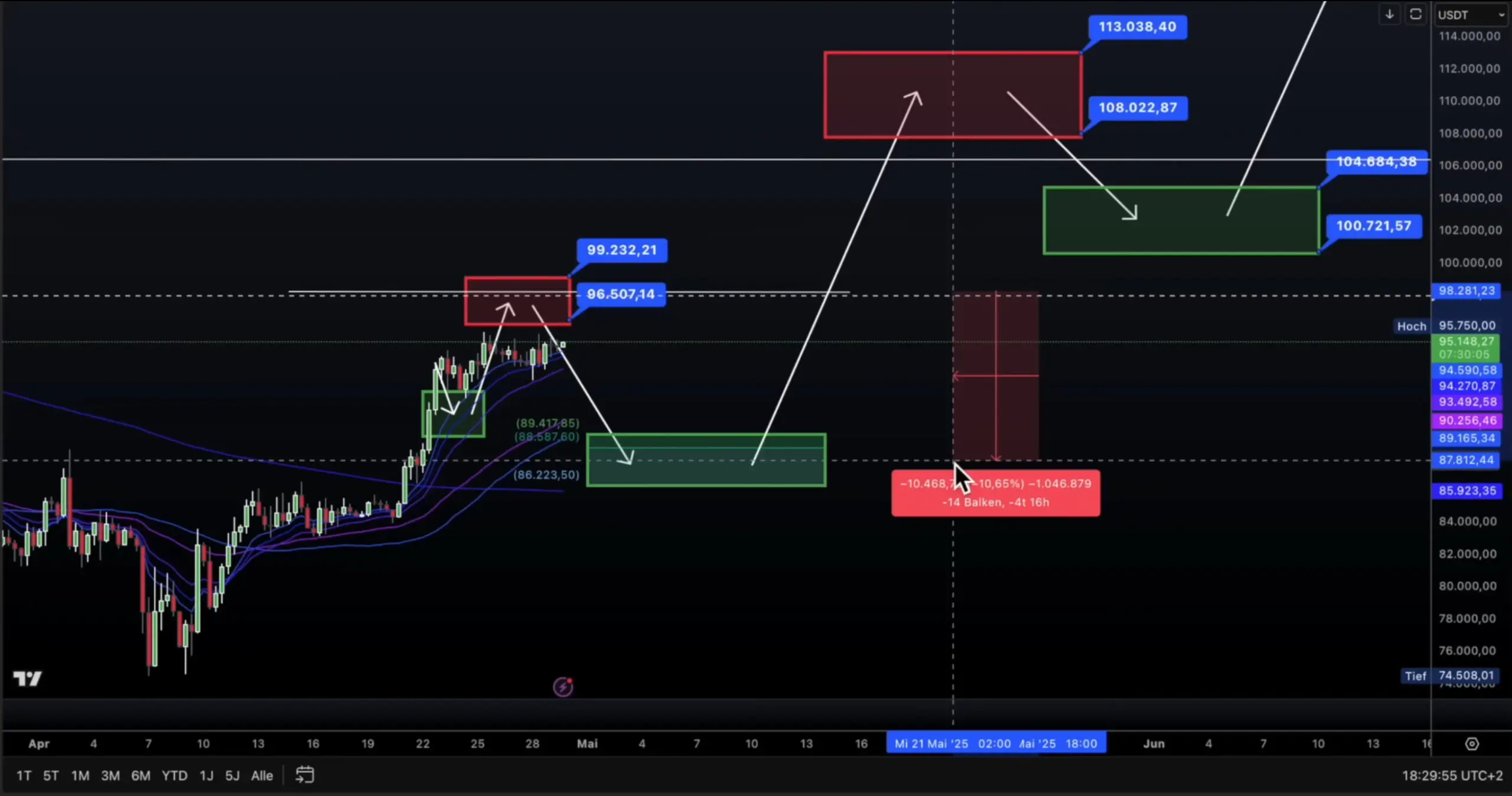 Grafikon prikazuje tehničku analizu cijena kripto imovine s pomoću svijećnjaka, EMA linija i zona podrške/otpora u USDT od travnja do lipnja. Na grafikonu su naznačeni ciljani cjenovni rasponi i očekivana kretanja cijena u nadolazećim mjesecima.