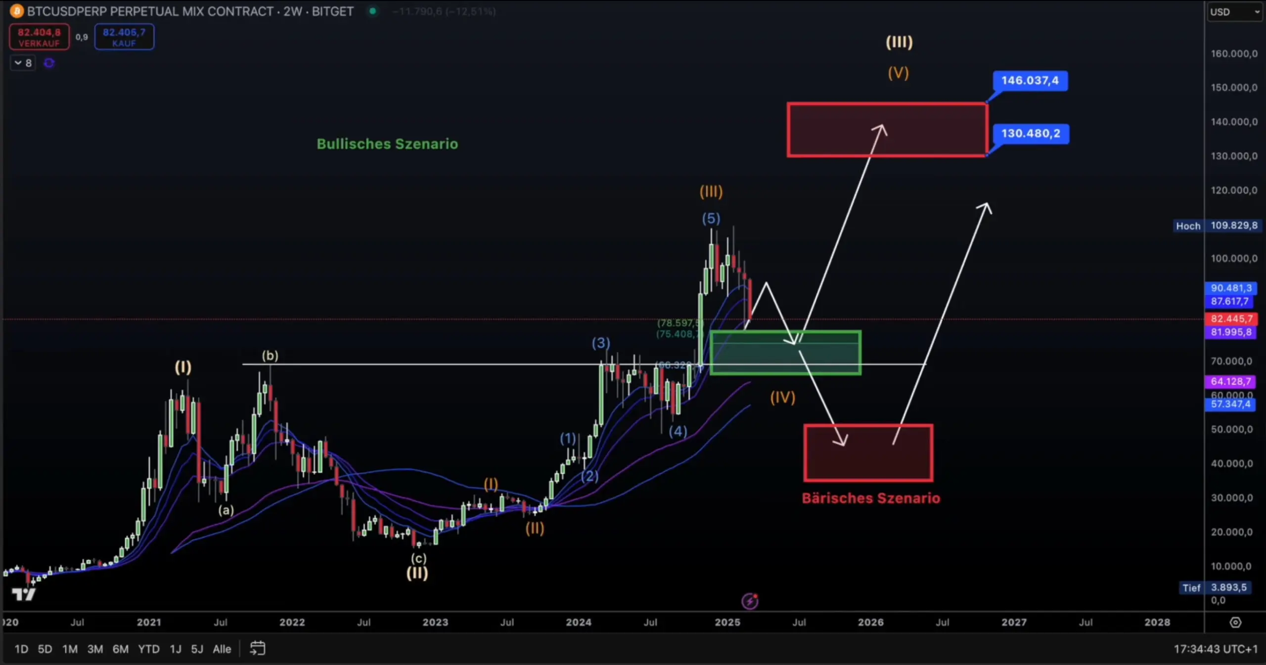 Grafikon prikazuje dugoročnu analizu BTCUSD na Bitget platformi s Elliottovim valovima, scenarijima rasta i pada cijene, razinama potpore i otpora, te prosječnim linijama cijene. Oznake Verkauf i Kauf ističu tekuće tržišne cijene.