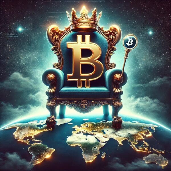 Slika prikazuje veličanstveni tron Bitcoina zlatne boje, smješten na obasjanom globusu uz simbol B. Iznad trona nalazi se kruna, koja simbolizira njegovu moć i dominaciju u svijetu kriptovaluta, dok zvjezdano nebo oko njega naglašava globalni utjecaj.