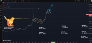 BTC/USDT na Binanceu prikazuje jednodnevni cjenovni grafikon s navedenom cijenom, obrascem probijanja s trendlinijama te razdobljima konsolidacije i volatilnosti do 2025. Ažuriranja označavaju ključne točke, dok emoji dodaje humor uz Pozdravlja vas Ino.