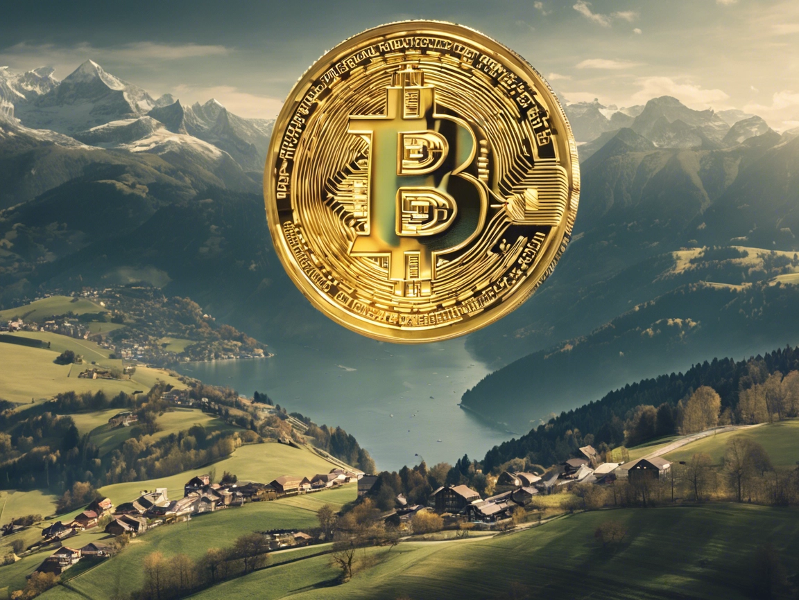 Na slici se ističe veliki zlatni Bitcoin novčić s složenim uzorcima u prednjem planu, dok u pozadini blista slikoviti alpski krajolik sa zelenim brdima, plavim jezerom i veličanstvenim snježno prekrivenim planinama. Ova scena simbolizira sklad između tehnologije i prirode.