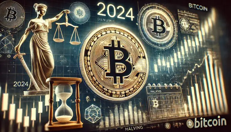 Središnji motiv slike je simbol Bitcoina u zlatnoj boji, okružen simbolima pravde i vremenskim oznakama, sugerirajući važnost nadolazećeg prepolovljenja nagrade za rudarenje u 2024. godini. Grafički prikazi tržišnih analiza prikazuju optimistične trendove, dok se ističu faktori koji utječu na budućnost Bitcoina.