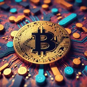 Slika prikazuje Bitcoin simbol na pozadini kripto berze. Simbol Bitcoin-a stoji usred osvetljenog ekrana sa digitalizacijom i blockchainom kriptovaluta, digitalizacija, spot etf