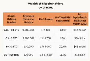 Tablica prikazuje raspodjelu bitcoin bogatstva po kategorijama vlasnika, s podacima o broju ljudi, postocima ukupne ponude BTC-a i procijenjenoj vrijednosti njihovih udjela u američkim dolarima.