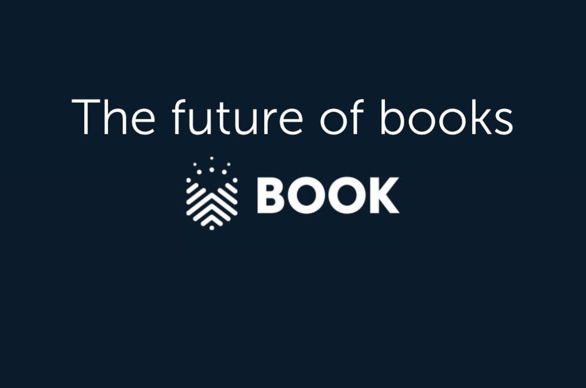 Na tamnoplavoj pozadini ističe se natpis Budućnost Knjiga u bijelom, modernom sans-serif fontu. Ispod se nalazi minimalistički logo s geometrijskim ikonama i riječju BOOK u velikim slovima, simbolizirajući digitalnu revoluciju u svijetu književnosti.