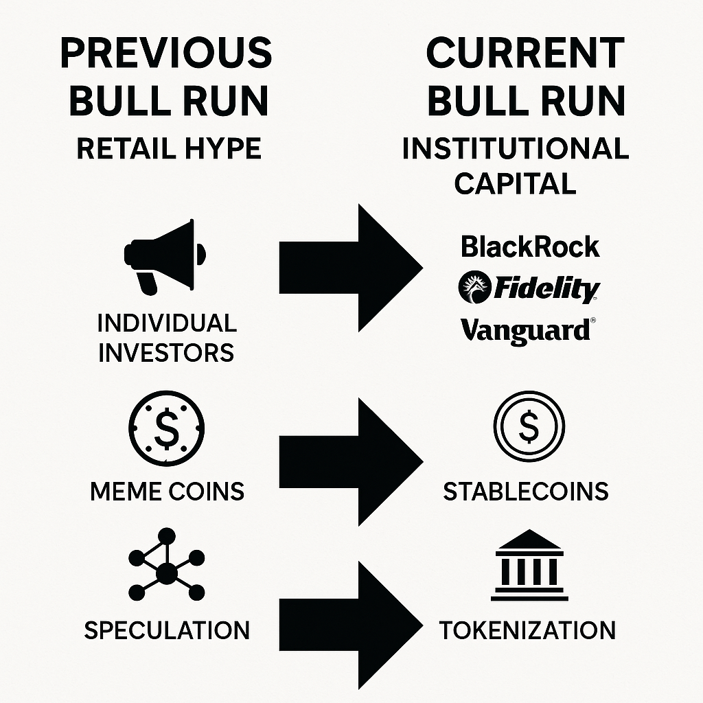 Minimalistička infografika prikazuje prijelaz kripto bikovskog rasta: od maloprodajnih spekulacija i meme kovanica do institucionalnog kapitala, stabilnih kovanica i tokenizacije.