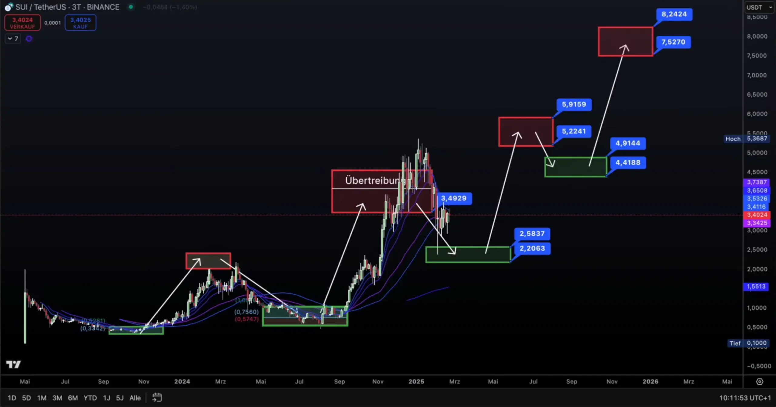 Grafikon prikazuje dugoročnu analizu cijena SUI/TetherUS para na Binanceu s tamnom temom. Zelene i crvene kutije označavaju zone podrške i otpora. Bijele strelice ukazuju na očekivanu kretanju cijena, dok plave brojke naglašavaju ključne cjenovne točke.