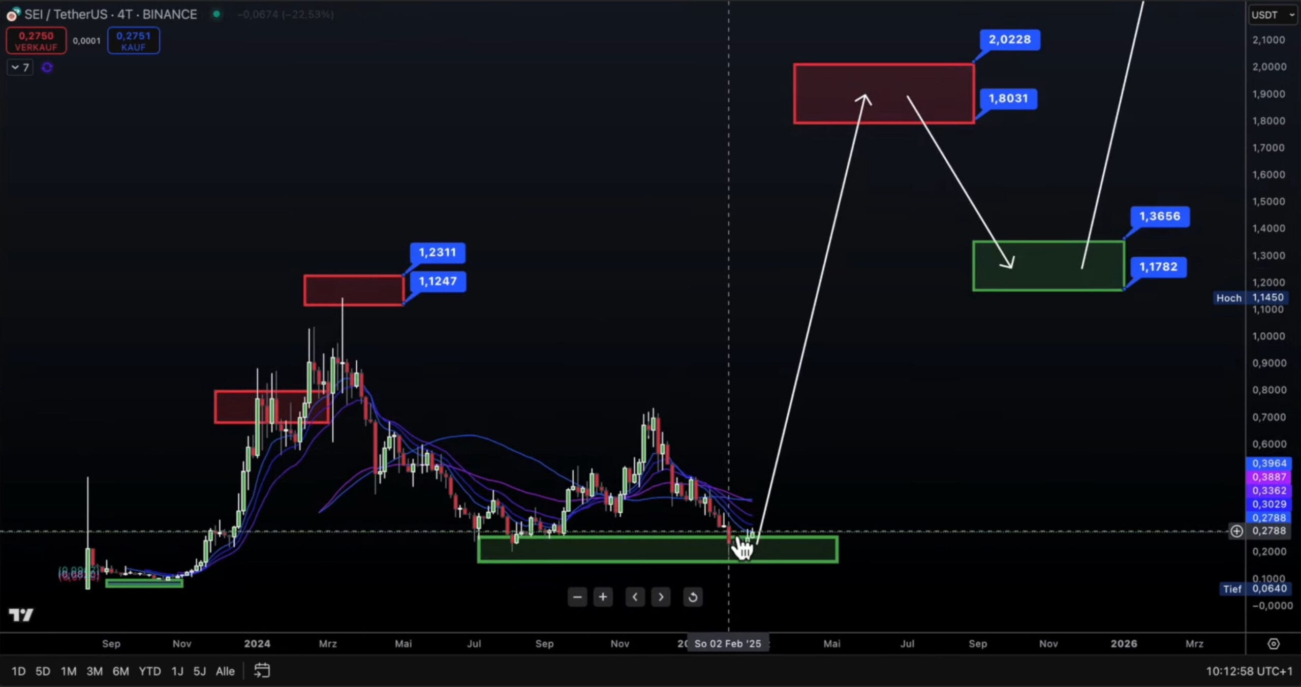 Grafikon prikazuje kretanje cijena kriptovalute SEI/USDT na 4-satnom grafikonu na Binanceu, s označenim zonama otpora i potpore. Zeleni i crveni pravokutnici ističu ključne razine, dok strelice prikazuju moguće smjerove kretanja cijena. Elementi su označeni njemačkim terminima.