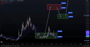Grafikon SKL/USDT na Binance platformi prikazuje kretanje cijena pomoću svijećnjaka u razdoblju od 2023. do 2026., s označenim zonama kupnje (zeleno) i prodaje (crveno). Plave i ljubičaste prosječne linije pomažu u prepoznavanju trendova.