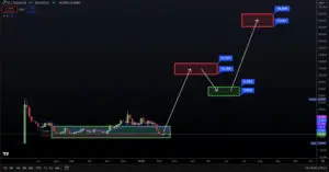 Tehnička analiza kripto valute IO/TetherUS na Binance burzi prikazuje kretanje cijena od sredine 2024. do početka 2025. koristeći svijećnjake, s podrškom označenom zelenim okvirom te moguće ciljeve prikazane crvenim okvirima, uz ključne razine cijena i strelice.