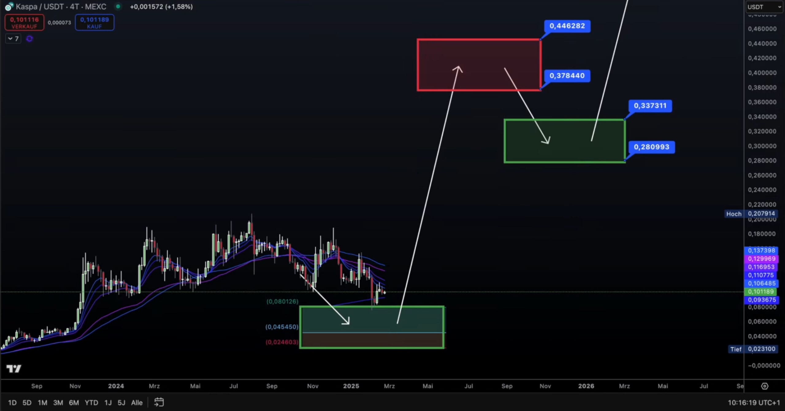 Grafikon prikazuje kretanje cijene Kaspa prema USDT koristeći japanske svijećnjake, s trenutačnom prodajnom cijenom 0.101116 USDT i kupovnom 0.101189 USDT. Označeni su ciljani rasponi cijena i potencijalna područja podrške i otpornosti kroz više vremenskih razdoblja.