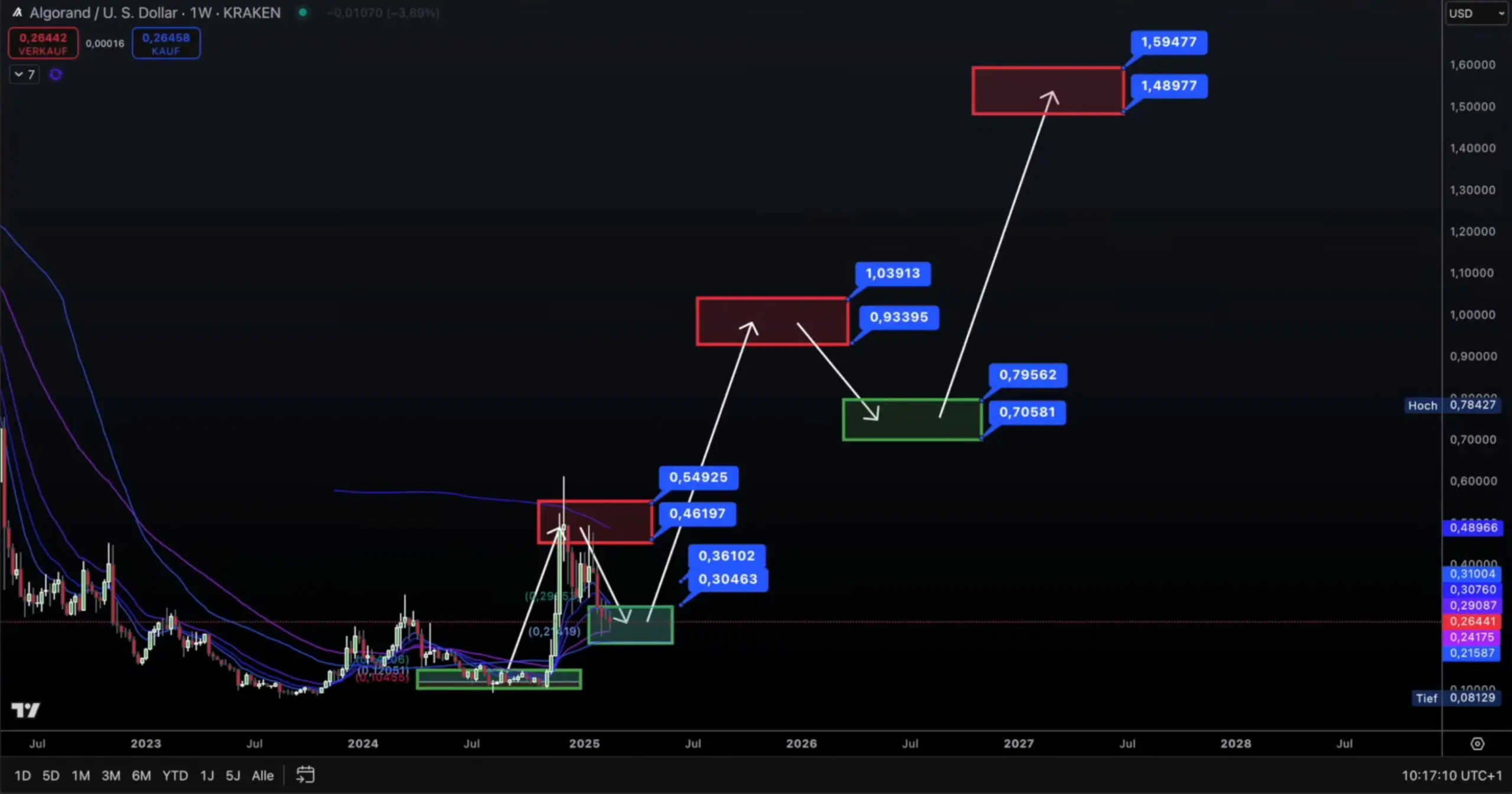 Tjedni grafikon cijena Algoranda (ALGO) prema USD na burzi Kraken prikazuje povijesne i projektirane cijene do 2028. godine. Obuhvaća svijeće s prosječnim kretanjima, zelenim i crvenim zonama podrške i otpora, te strelice koje sugeriraju budući uzlazni trend.