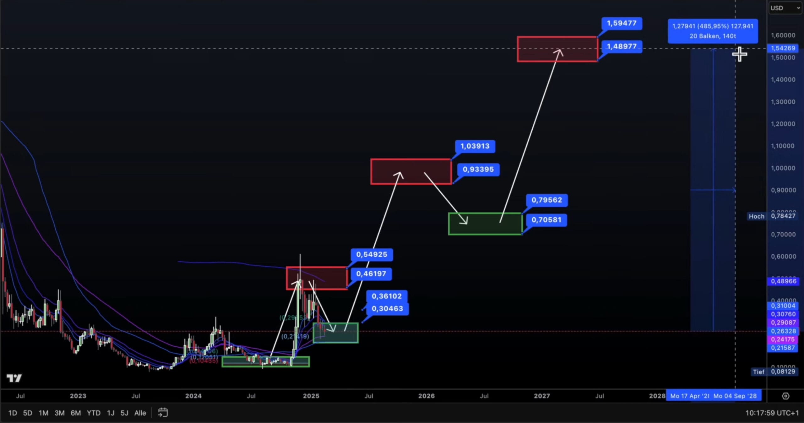 Prognoza cijena za razdoblje 2023-2028 prikazuje trendove s predviđenim točkama rasta i otpora, označenim zelenim i crvenim okvirima te strelicama. Pokretni prosjeci u plavim i ljubičastim tonovima ilustriraju podršku, s ključnim datumima i postotkom rasta od 485.95%.