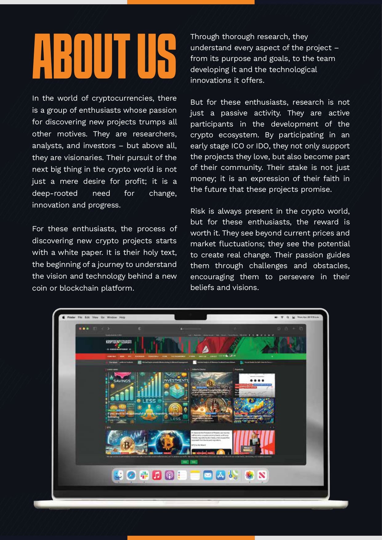 Slika prikazuje entuzijaste kriptovaluta koji istražuju inovacije u digitalnom financijskom ekosustavu. Istaknuti naslov O NAMA u narančastoj boji vodi u odjeljke koji objašnjavaju njihov angažman kroz analizu projekata i sudjelovanje u ICO-ima i IDO-ima, uz računalnu grafiku koja naglašava njihovu strast prema tehnologiji.
