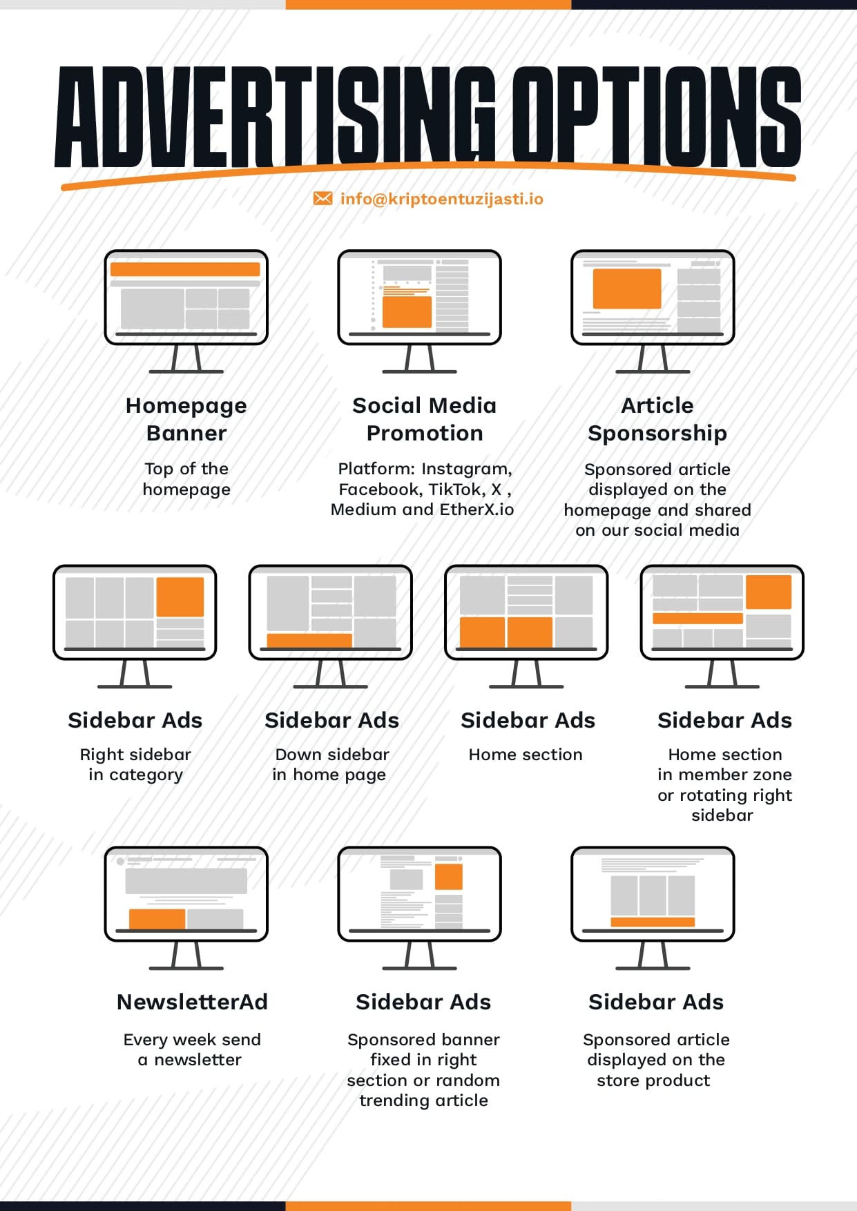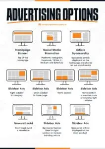 Slika prikazuje različite opcije oglašavanja na digitalnoj platformi, uključujući banner na početnoj stranici, promoviranje na društvenim mrežama te sponzorirane članke. Također su uključeni sidebar oglasi i tjedni newsletter oglasi, pružajući raznolike strategije za marketinške ciljeve.