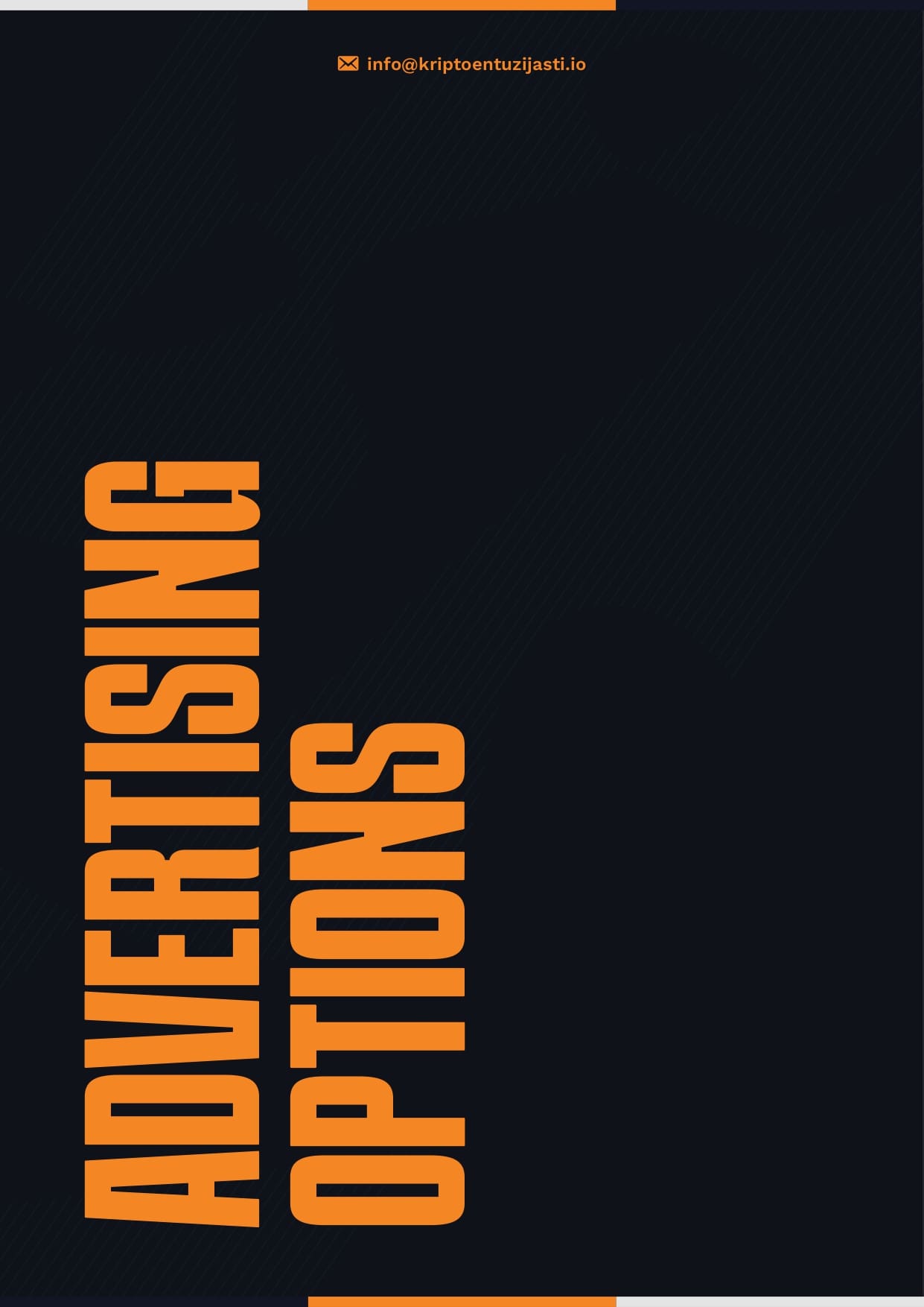 Slika prikazuje moderni dizajn s tamnom pozadinom i naglašenim narančastim elementima koji ističu informacije o opcijama oglašavanja. Veliki tekst OPCIJE OGLAŠAVANJA okrenut je vertikalno, a iznad je narančasta traka s email adresom za kontakt.