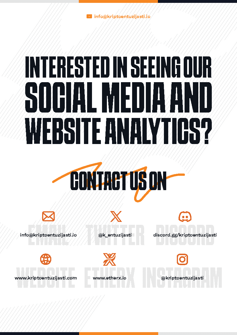 Ova promotivna letak ističe digitalnu komunikaciju, s naglaskom na analitiku društvenih mreža. U pozadini je suptilni uzorak dijagonalnih linija, a u središtu se nalaze kontakti putem ikona za email, Twitter, Discord, web, EtherX i Instagram, s naglašenim pozivom na akciju.