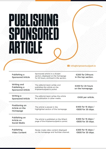 Dokument prikazuje cjenik i usluge za objavu sponzoriranih članaka s modernim dizajnom u crno-bijelo-narančastoj boji. Uključuje jasne cijene i opise raznih usluga, poput pisanja i objave članaka, te kontakt informacije za zainteresirane klijente.