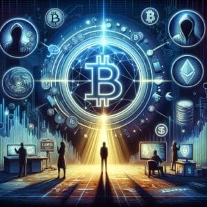 Futuristički prikaz ekosustava kriptovaluta s dominantnim Bitcoin simbolom, okruženim različitim kripto ikonama i mrežnim uzorcima. U fokusu su ljudi koji koriste digitalne sučelje za analizu i praćenje tržišnih trendova, dok figure u kapuljačama dodaju tajanstveni element.