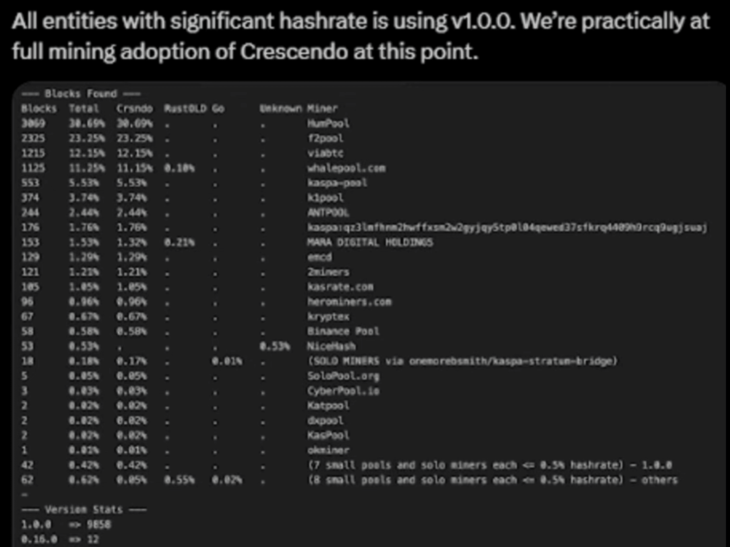 Grafikon prikazuje raspodjelu blokova koje su rudarski entiteti generirali, s naglaskom na usvajanje Crescendo softvera verzije 1.0.0. Prikazuje poznate entitete i nepoznate rudare, ističući da većina koristi novu verziju, dok je nekoliko entiteta na starijoj verziji.