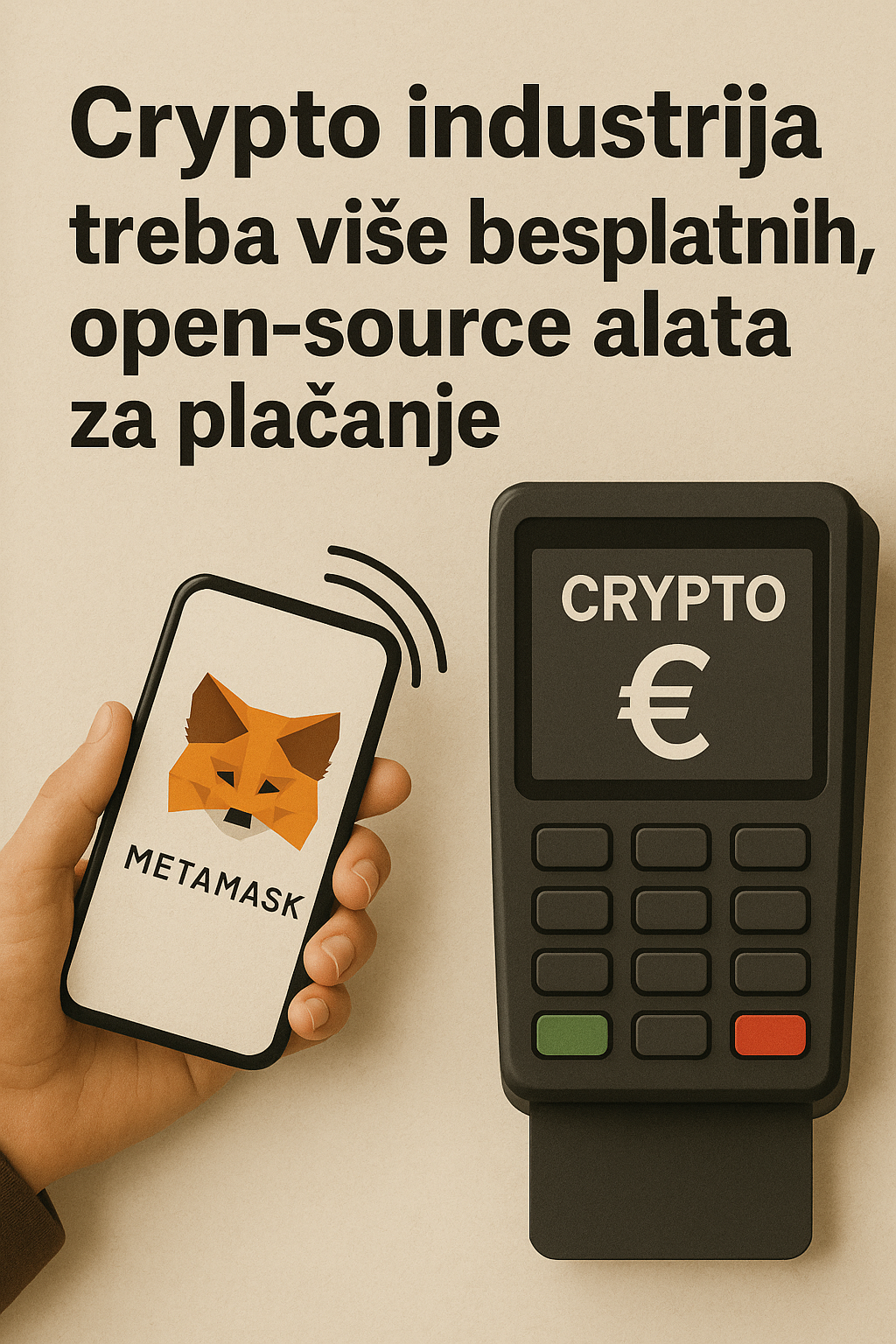 Na slici je prikazana ruka koja drži pametni telefon s MetaMask logotipom, usmjerena prema POS terminalu na kojem piše CRYPTO i euro znak, uz poruku o važnosti otvorenih kripto alata za plaćanje.