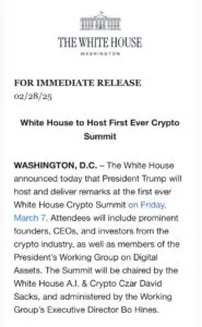 Službena najava Bijele kuće: prvi Krypto summit 2025. Predsjednik Trump domaćin povijesnog događaja 7. ožujka, s ključnim liderima iz kripto industrije. Sastanak će voditi David Sacks, A.I. & Crypto Czar, uz Bo Hinesa kao izvršnog direktora.