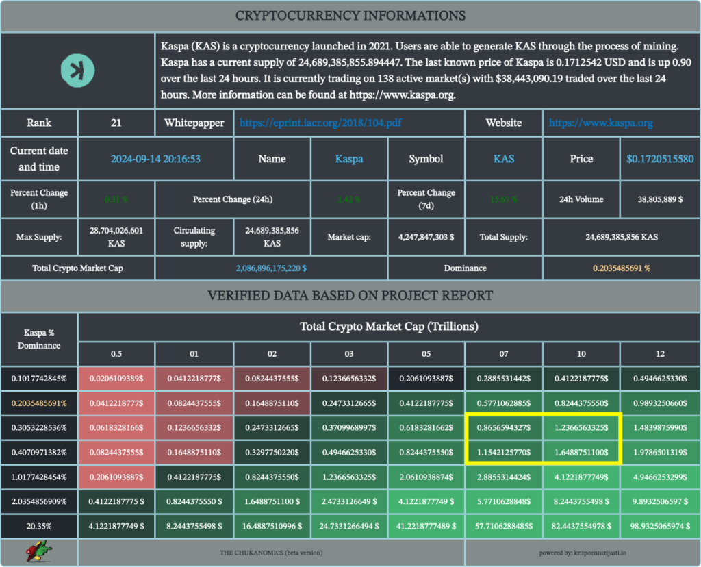 3. Makroekonomski faktori: Tržište kriptovaluta u cjelini ima značajan uticaj na vrijednost pojedinačnih projekata. Tokom bull runa, investitori su skloniji riziku i često ulažu u manje poznate projekte u nadi da će ostvariti veći povrat na ulaganje. Ako se opći sentiment tržišta promijeni na pozitivan i ukoliko Bitcoin i druge vodeće kriptovalute započnu novi ciklus rasta, to bi moglo stvoriti povoljne uvjete za KASPA. U tom kontekstu, cijena od 10$ može izgledati mnogo dostižnije nego u trenutnom tržišnom okruženju.