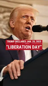 Na slici je osoba za govornicom tijekom formalnog događaja, drži govor u povijesnoj ili vladinoj zgradi. U fokusu je natpis: TRUMP PROGLAŠAVA 20. SIJEČNJA 2025. DAN OSLOBOĐENJA, što naglašava važnost poruke i trenutka.
