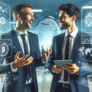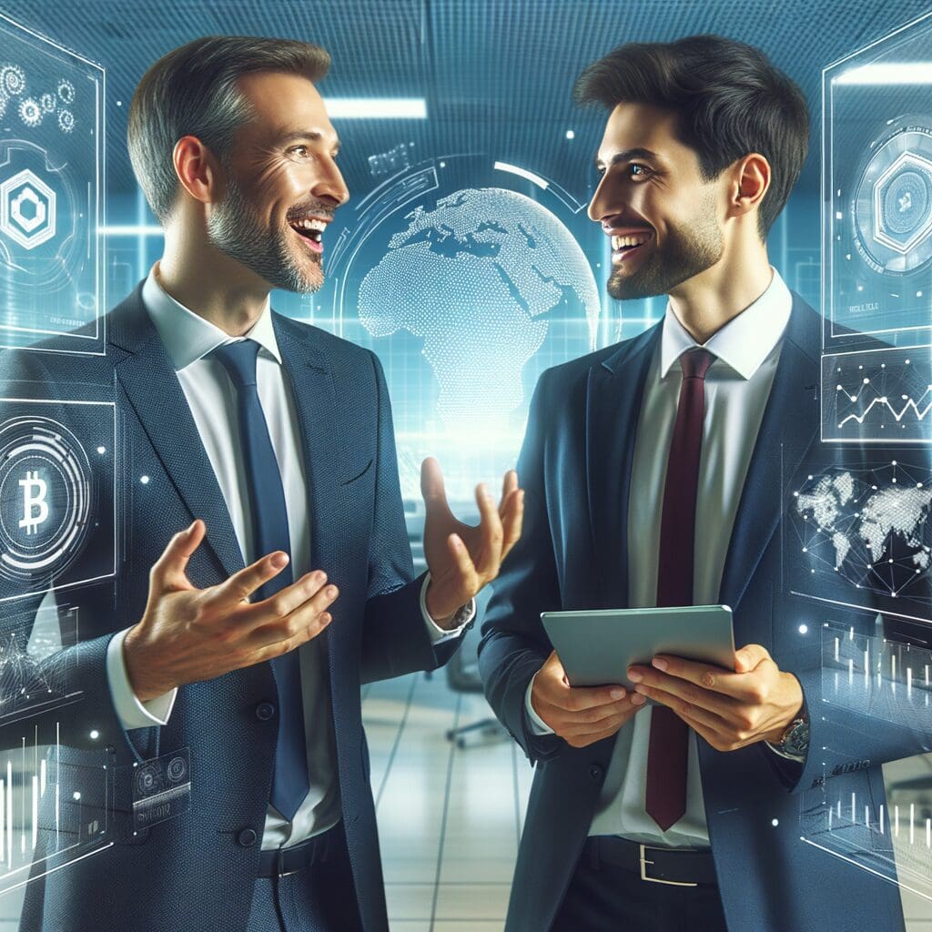Dva izvišena poslovna muškarca oduševljeno razgovaraju u modernom uredu s digitalnim ekranima. Njihova interakcija, uz korištenje tableta i gestikulacije, sugerira diskusiju o kriptovalutama i inovacijama, unosi dinamičnost i tehnološki napredak u poslovno okruženje.