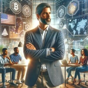 Slika prikazuje samouvjerenog voditelja u elegantnom odijelu kako stoji s prekriženim rukama, ispred mladog, raznolikog tima koji sudjeluje u grupnoj raspravi u modernom uredu. Pozadina s digitalnim simbolima tehnologije i kriptovaluta naglašava inovativnu i suvremenu poslovnu atmosferu.