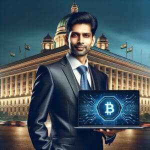 Profesionalno odjeven muškarac stoji ispred impozantne arhitektonske zgrade, držeći laptop s Bitcoin simbolom na ekranu. Njegov blagi osmijeh i samouvjeren stav ukazuju na njegovu stručnost u digitalnom financijskom sektoru, dok zgrada s klasicizmom naglašava spoj tradicije i tehnologije.