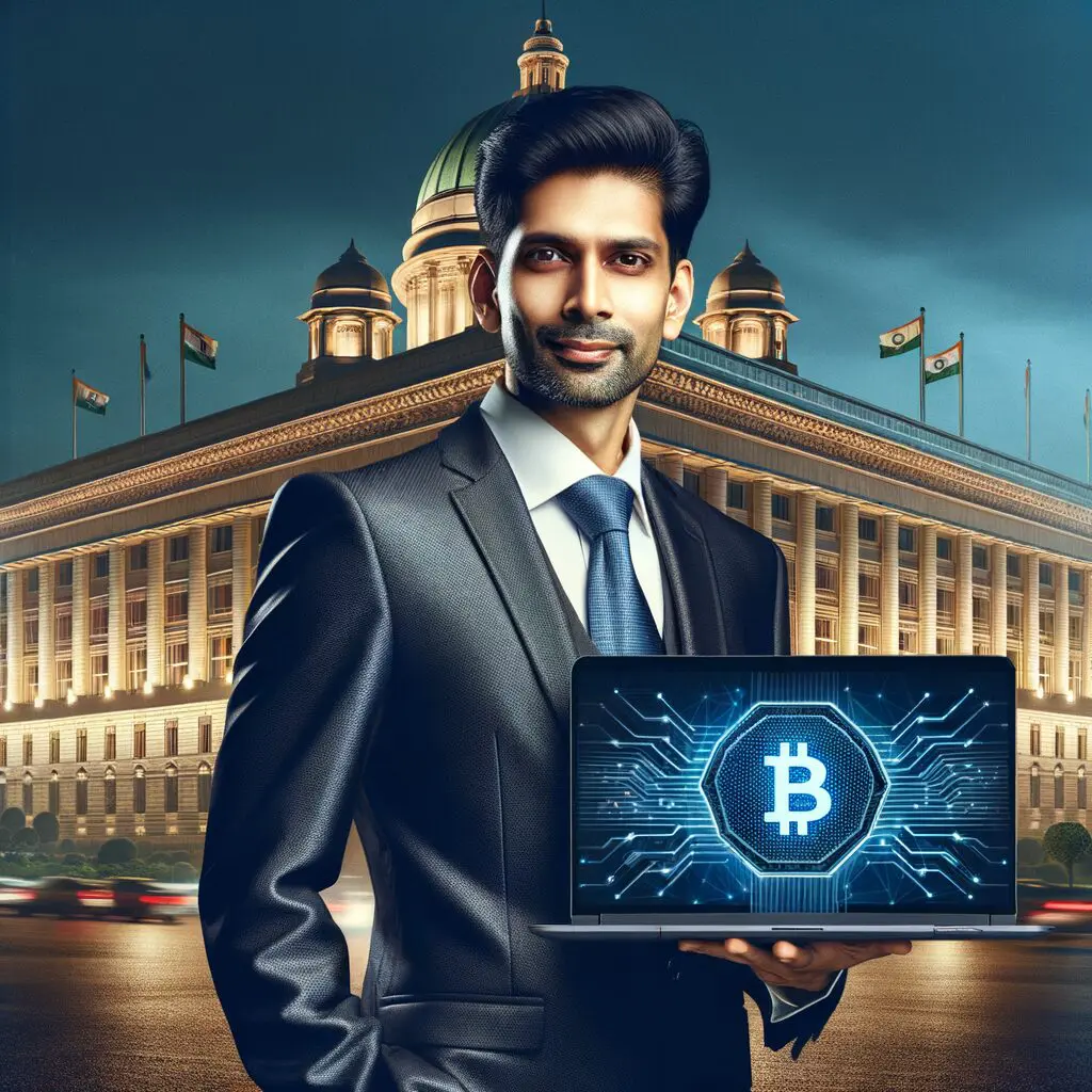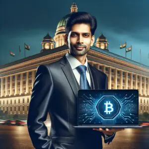 Profesionalno odjeven muškarac stoji ispred impozantne arhitektonske zgrade, držeći laptop s Bitcoin simbolom na ekranu. Njegov blagi osmijeh i samouvjeren stav ukazuju na njegovu stručnost u digitalnom financijskom sektoru, dok zgrada s klasicizmom naglašava spoj tradicije i tehnologije.
