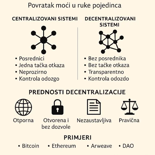 Infografika uspoređuje centralizirane i decentralizirane sustave s naglaskom na prednosti decentralizacije poput otpornosti, otvorenosti i pravednosti, koristeći primjere poput Bitcoina i Ethereuma, te prikazuje kako decentralizacija vraća moć pojedincu.