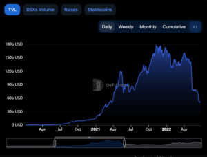 Grafikon prikazuje Total Value Locked (TVL) u DeFi sektoru od 2020. do 2022. TVL raste od sredine 2020., doseže vrhunac u 2022. s 180 milijardi USD, a zatim naglo opada. Grafikon ilustrira tržišne fluktuacije i volatilnost.